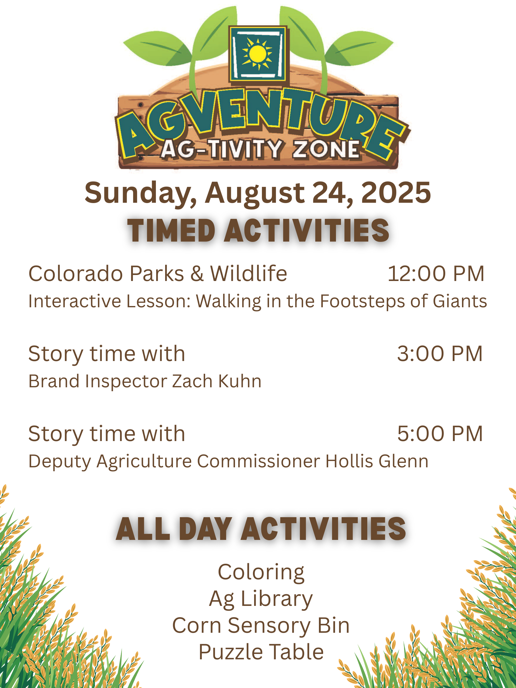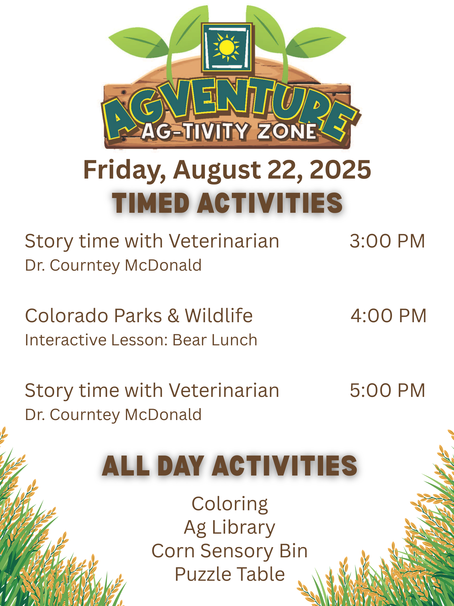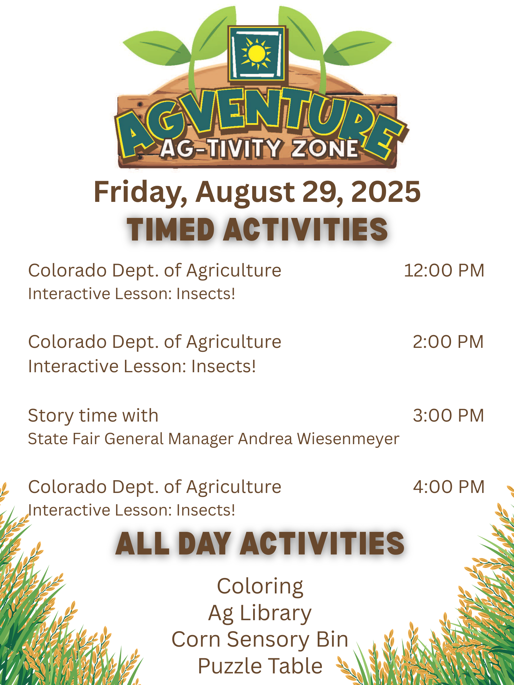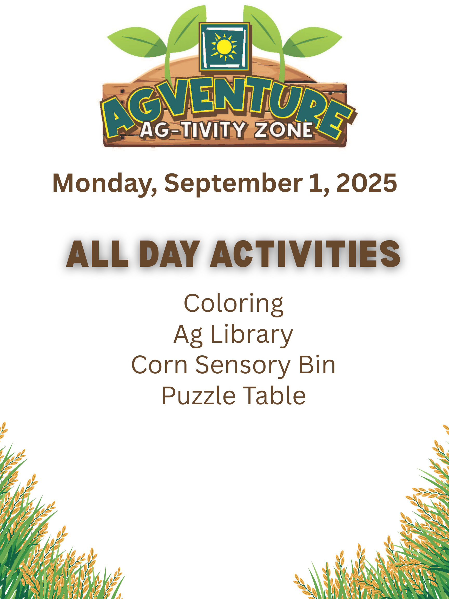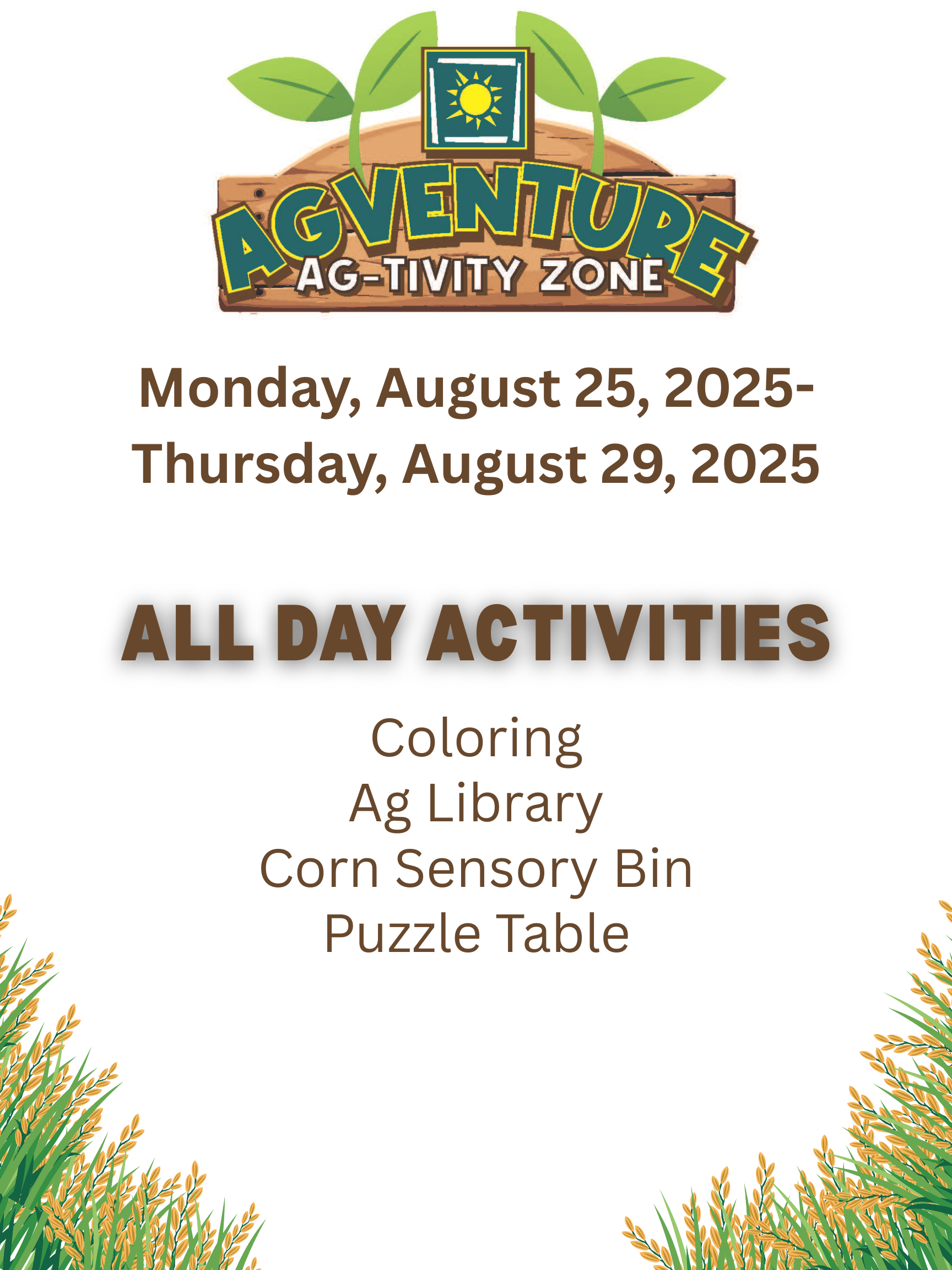 Don’t miss the all new AgVenture Land in the Ag Pavilion. Free, fun, interactive activities for kids of all ages can be found in this reimagined space. All day activities include: